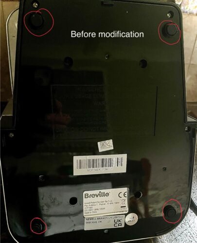 The most significant problem with the machine is the loud vibration that will shake a two cup setup apart resulting in spillage. Initially I reduced this by placing the cups on a folded paper kitchen towel. After experimenting the best solution is to buy a sheet of 22mm diameter x 10mm self adhesive silicone feet. This reduces the noise and vibration. (See pictures, use only 4 feet at the corners or the vibration will come back). A pity that Breville didn’t seem to detect the problem in the design stages and add deep silicone feet costing a few pence.