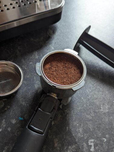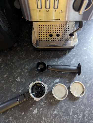 - The portafilter is a little bit cheap feeling and the notch basket design isn't ideal in my opinion as it can be a little tricky to get the basket out, especially after getting the puck out. You need to swill and dry the basket to easily take it out after use. I'd recommend buying a new portafilter for it once you get the hang of pulling shots with it.